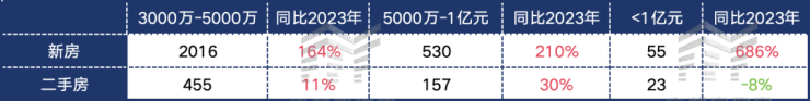 2024年,上海3000万-5000万的新房成交套数,同比2023年有164%的涨幅,5000万-1亿元新房成交套数,同比2023年则有686%的涨幅。