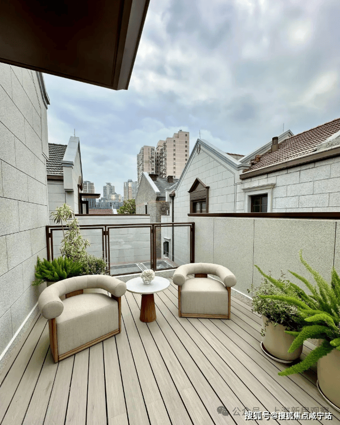 从庭园看向别墅,保留的老山墙、砖楣和门头,再加上悬挑阳台和层层露台,这种传统风貌带给人一种重见历史的感慨,又有温馨、宁静的现代舒适感。