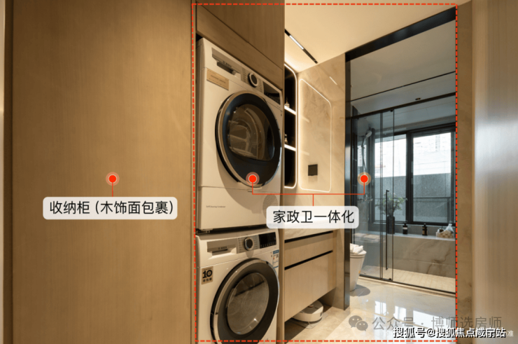 值得一提,家政卫一体化,动线更流畅,洗完澡可以顺手把脏衣服放到洗衣机,更彻底解放阳台,阳台不用晾晒,完全成为志趣空间。