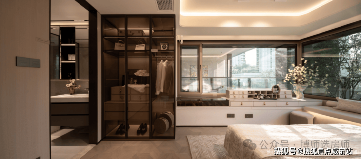 主卧则可放置600mm进深的衣柜(一般主卧多见550mm柜体),而且它能放下双衣柜;主卫镜柜分类也格外精细,让女主人收纳井井有条。