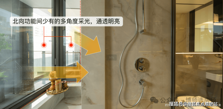 相比常规户型只是全卧飘窗布置,Bund98户型不仅厨房带飘窗,主卧和两个卫生间更带双侧采光的270度飘窗,总共七个飘窗,飘窗不计入建筑面积,附赠远超常规户型。