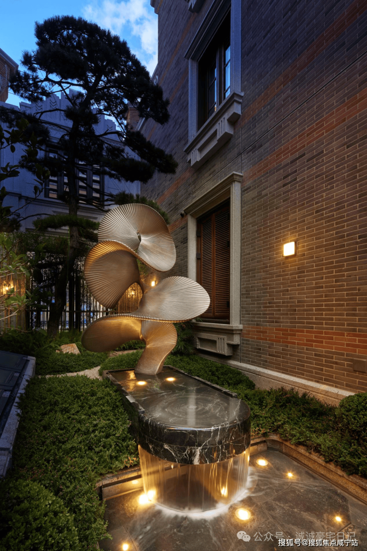 地面延续酒店式落客区海棠纹拼花镶钻,铁打纹工艺,其间还有老石板,青石板,中国黑老石皮,柏坡黄的石皮等原石原面铺装,老石皮从大料里取出,数量少而贵,由此也可看出保利·永兴里在别墅打造上是真舍得,也是真高级。