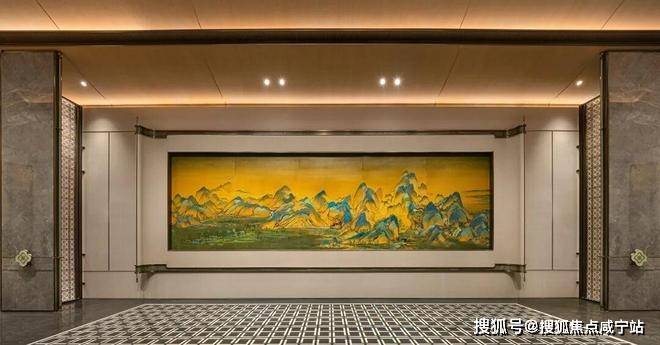 穿过门厅,九米巨幅《千里江山图》非遗漆画豁然眼前,天然大漆经千道工序打造,还原青绿山河壮阔,诠释归家即入传世名画的礼序