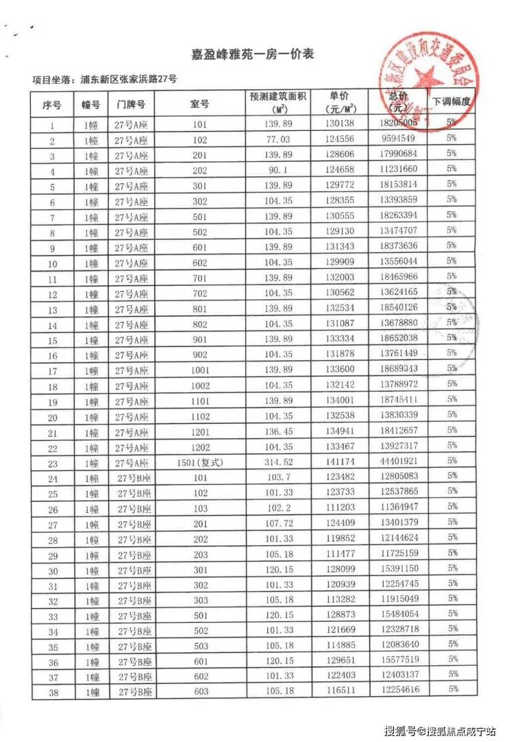 嘉盈峰一房一价表(开盘价)