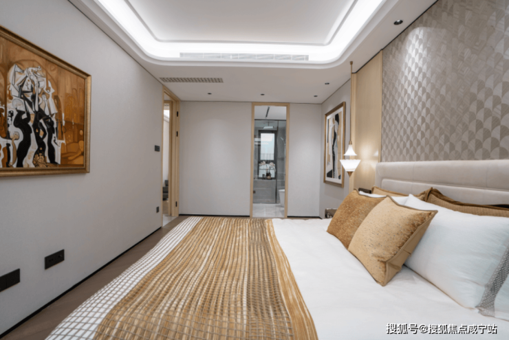 另外,像卧室地板,没有采用常规横拼、竖拼,而是采用复杂的斜拼,只为更美观;吊顶设计同样暗藏匠心,采用多层次曲边造型,为空间增添优雅的线条感。