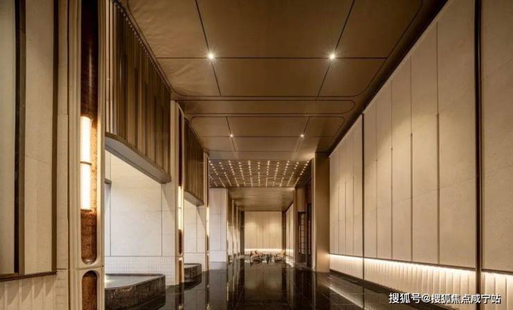 以社区北侧主入口的「鎏金」序厅为例,其设计便足以窥见公区的品质匠心:序厅总挑高约6米、总展面达30米,开阔尺度尽显气派;北向一字排开的8根华之柱,采用古铜色复古肌理双曲面铝板打造,搭配奢石材质,更以毫米级钻石切割工艺为石材勾勒出多层次立体镶边,精致感拉满。
