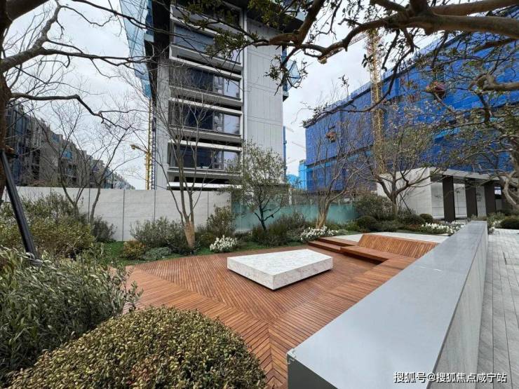 通道两边都做了如下这样的休闲卡座、绿化带、小组团景观,极力弱化了小区的边界感;两边地块的入户门头连同地面铺装也都是做好的。