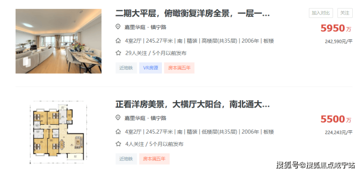 这个小区的挂牌均价不过15-16万/㎡,但高区能看低密洋房的房源挂牌价普遍超过20万/㎡,最高能超过24万/㎡。