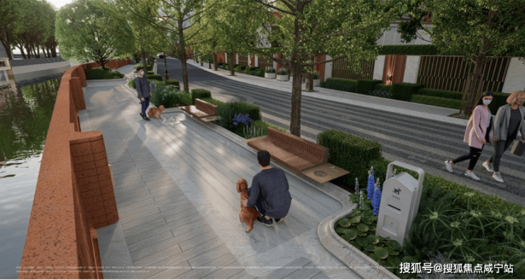 约7000㎡风貌邻里新弄堂延续石库门肌理,将社区咖啡、艺术工坊、便民市集等多元业态融入其中,构建开放、融合的步行尺度共同体—— 文艺氛围与人间烟火在此交织,打破了高端社区的疏离感。而九龙路滨水归家秘境,通过宠物友好花园、文化记忆景墙、适老化座椅