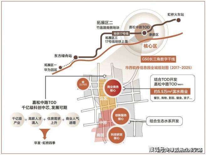 随着大虹桥科创功能西移发展的趋势,青浦新城基于“一城两翼,一带三核”发展战略目标,通过17号地铁线串联起三大核心节点,东起徐泾北斗产业基地,西到金泽华为研发基地,中部核心就是赵巷市西软件信息园,未来这条产业带上预期将会有数十万人口导入。