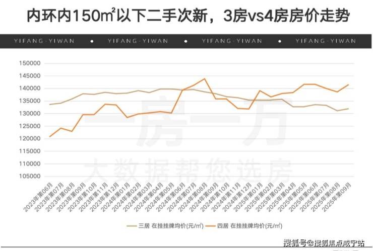 我获取了内环内120-150㎡3房和4房的二手次新房挂牌价走势,很明显4房在市场逆行期韧性更强。