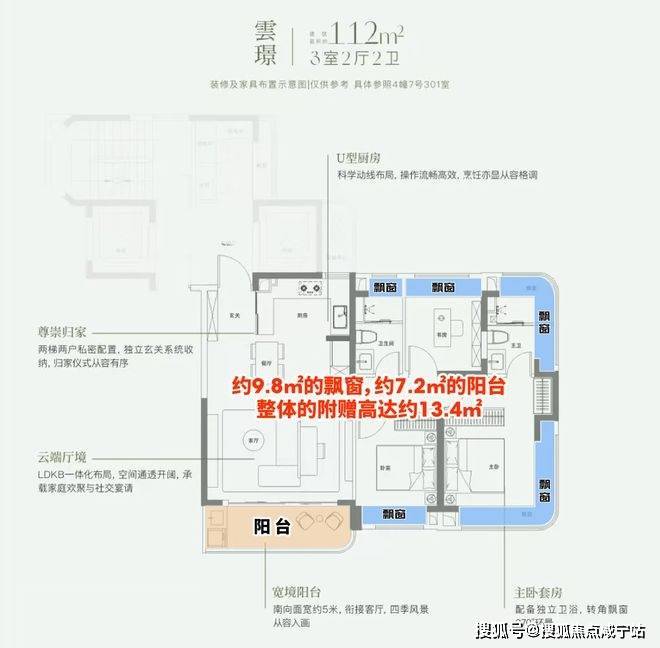 这个户型有约9.8㎡的飘窗,约7.2㎡的阳台,整体的附赠高达约13.4㎡。这是目前上海外环沿线,是附赠率最高的一个小高层产品。