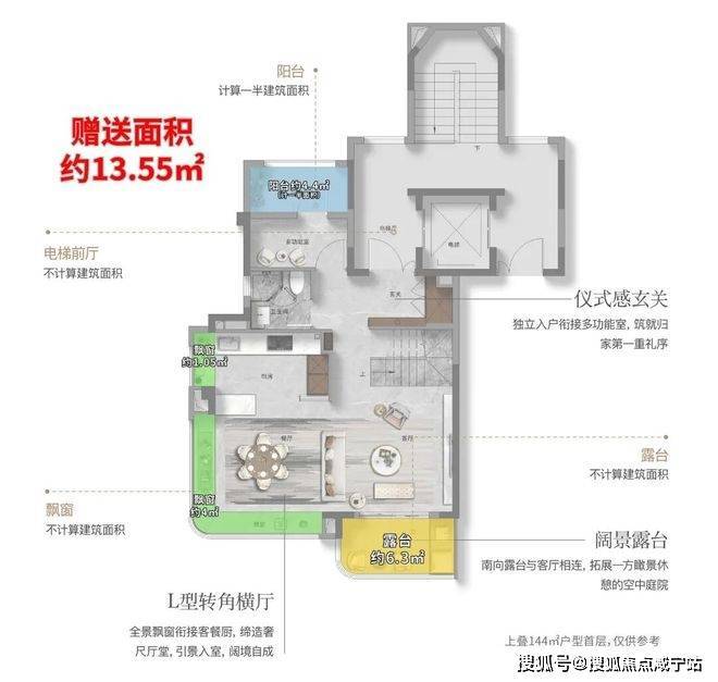 建面约144㎡的上叠产品,通过巧妙的挑空、总计约15㎡露台及灵动空间设计,让户型的实际可使用面积高达约180㎡,实得率约125%。