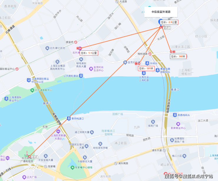 实际地图上丈量一下外滩道和它们之间的距离,陆家嘴地标东方明珠直线距离不过2.5km,开车有两条隧道,坐地铁有4、12、18号线可换14号线到达;北外滩和杨浦滨江的企业总部集群,更是步行即达: