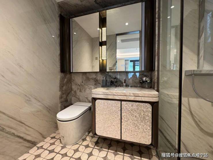 两个卫生间墙面都是岩板,其中主卫镜柜背部我们看不到的地方,都是大理石覆面;台盆下方的橱柜面板都是珠光贝母贴片,非常精致。