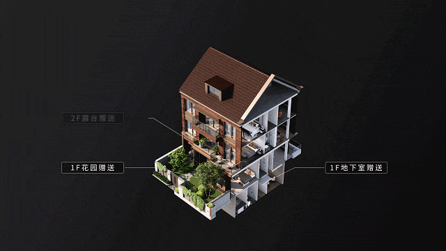 赠送率极高:首层私家花园、地下室、采光花园全赠送;二层大面积阳台露台赠送;三层大尺寸露台赠送,并带有闷顶。