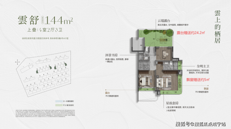 约144㎡上叠,入户独立梯厅,带来更好的功能利用和私密性。