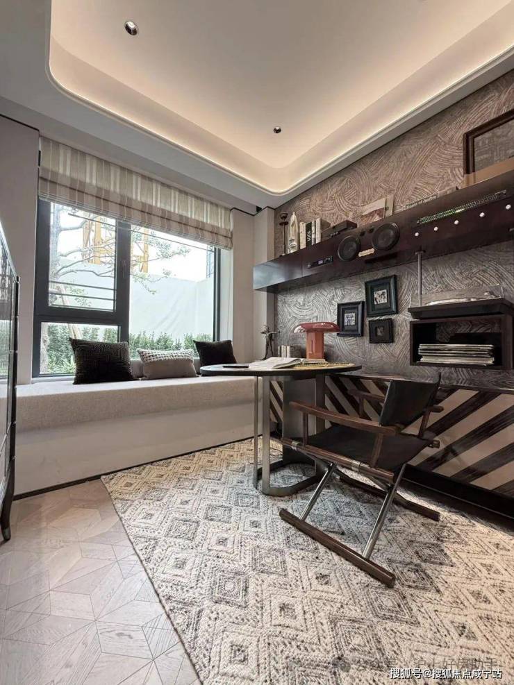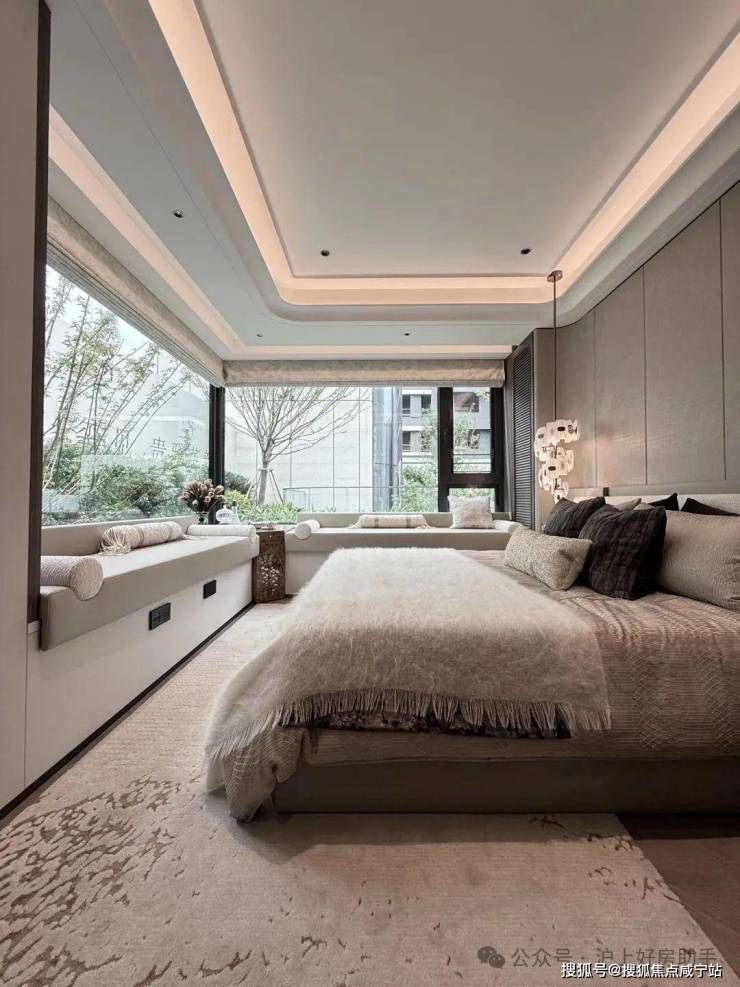 再来看看134㎡3室2厅2卫样板房。比起112㎡户型,这个客厅要宽敞很多,岛台也可以做成独立样式,摆放6人长桌也绰绰有余。主卧采用270度拐角飘窗设计,采光面拉满。