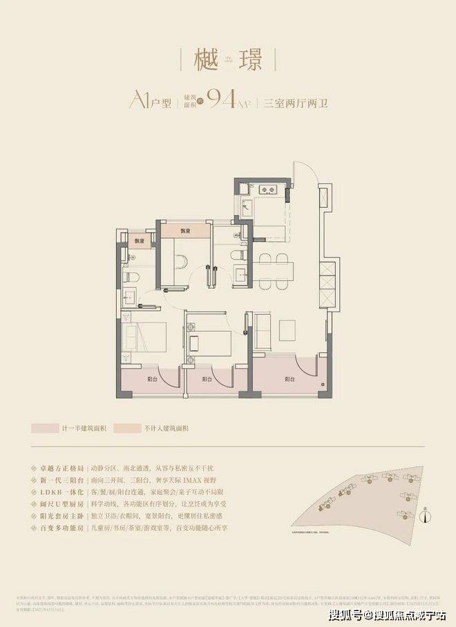 大华望樾建面约94㎡高层户型居然做到了三阳台的配置,远远超过新规标准。