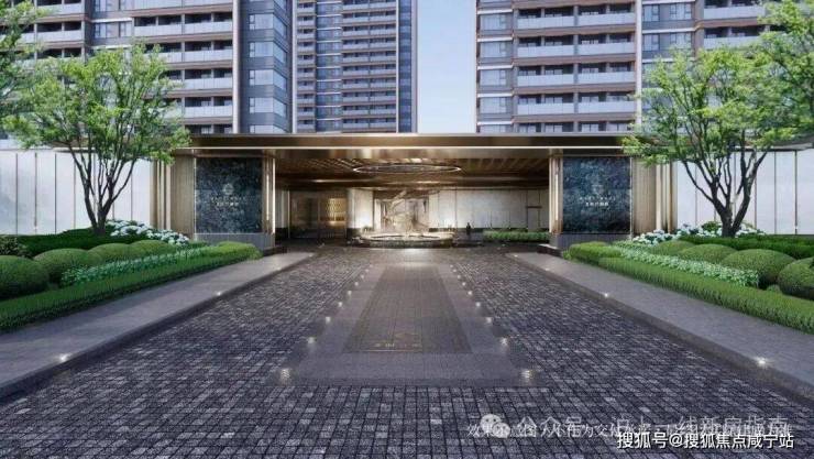酒店式社区入口,设环岛落客区,高定入户大堂,设飘顶弧形雨棚,顶部采用香槟金色的斜角造型铝板,搭配手工打磨的星空顶及氛围灯,地面铺设仿石砖,墙面基调则借鉴了华尔道夫酒店的浅米黄色系大理石,并配以精致的礼仪灯设计。