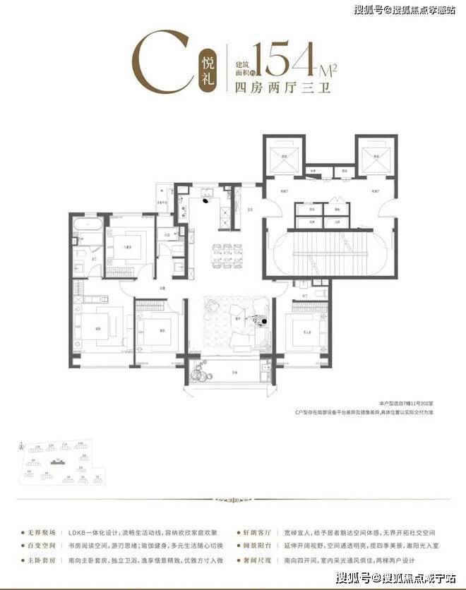 4房2厅3卫设计,整体格局方正,南北通透,四开间超14米奢阔尺度,阳光清风肆意流淌。约9.9米阔绰LDKB一体化空间,大尺度的竖厅设计,容纳多元家庭欢欣团聚。