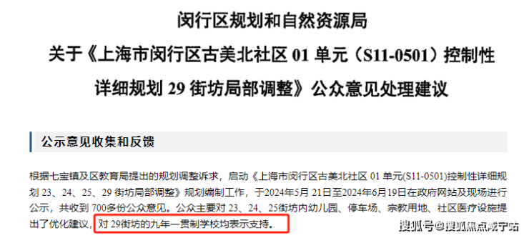 10月18日,闵行区规划和自然资源局发布《上海市闵行区古美北社区01单元(S11-0501)控制性详细规划29街坊局部调整》批后公告,表示对29街坊的九年一贯制学校均表示支持。