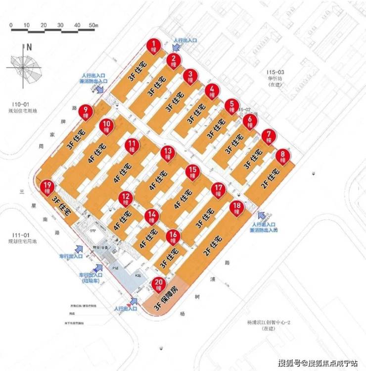 根据项目规划设计方案,地块拟建6栋4F叠墅、13栋2-3F合院,以及1栋3F保障