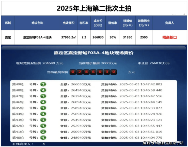 3月3日,上海2025第二批次土拍,经过49轮竞价,招商蛇口以266030万元的总价摘得嘉定新城远香湖F03A-4地块,溢价率30%,成交楼板价约31850元/㎡。