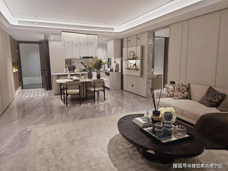 入户这座铸铝门,质感厚重;通顶玄关柜,内置消毒精灵,奢石把手+奢石台面更显海派温润气质,玄关地面都铺上了海上·清和玺的logo拼花,小小玄关做到了既实用又美观。