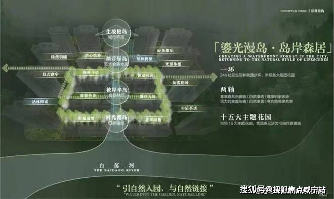 以“山水聚场”理念,规划“一环两轴十五园”景观布局,将水岸、岛屿、森林、花园、树屋作为园林节点,形成“行在景中、坐在岛中、游在林中、意在境中”的美学表达,营造出沉浸式山水活力场域。