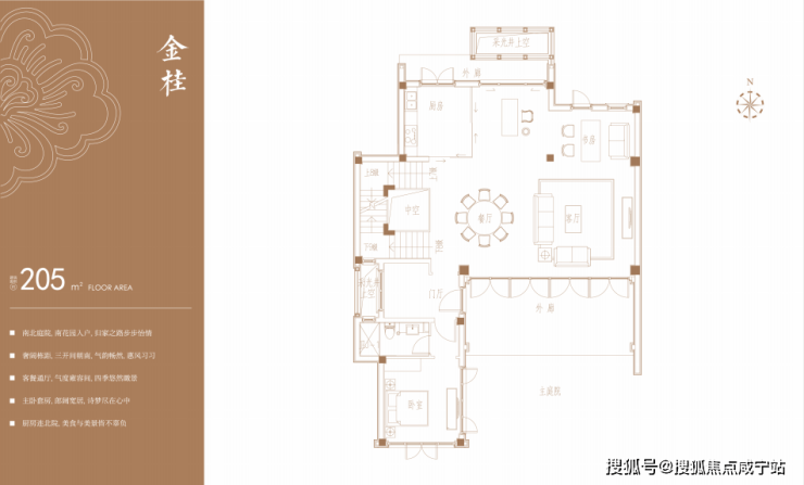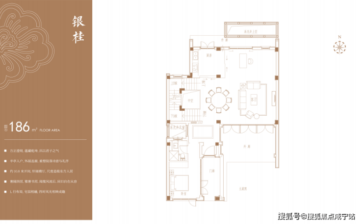 园内布局五进制南北主轴、以及“双龙戏水”格局的双水街,巷道联通,设七大景观组团,形成“一环、两轴、七境”布局。175席中式园宅,依巷分布南北,横平竖直,秩序井然。