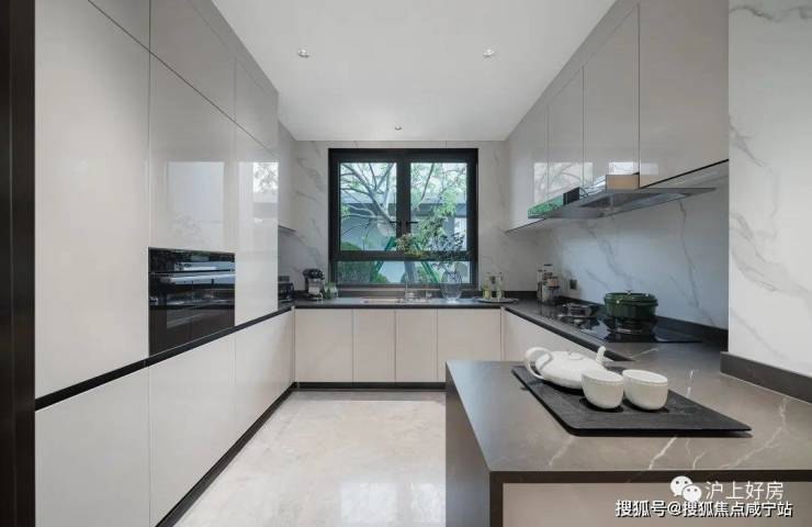厨房玻璃门是 上轨道移门,意味着地面部分没有任何轨道,不会有灰尘积攒,炒菜时关上,避免油烟散入室内;平时拉开,可以扩充室内视觉感受。