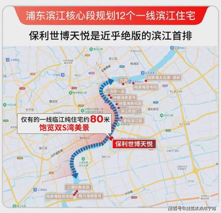 ①保利世博天悦是近乎绝版的滨江首排,直线距离黄浦江只有约80米,与江几乎“触手可及”
