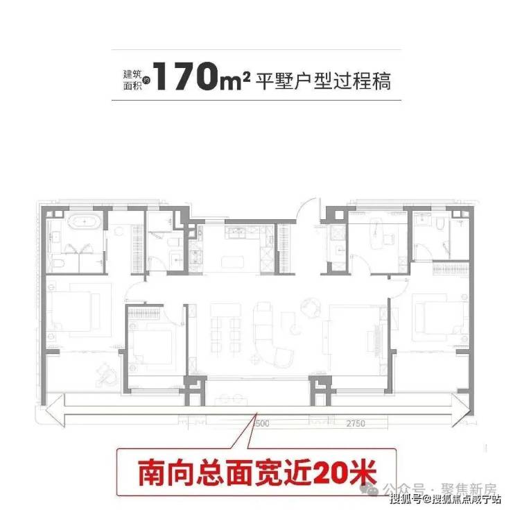建面约170㎡户型: 直接放大招, 五面宽,南向总面宽17.2米,客厅面宽8.2米,主卧面宽5.4米 ,自带衣帽间、独立收纳空间。 三个套房设计,把豪宅该有的尊崇感安排得明明白白 。