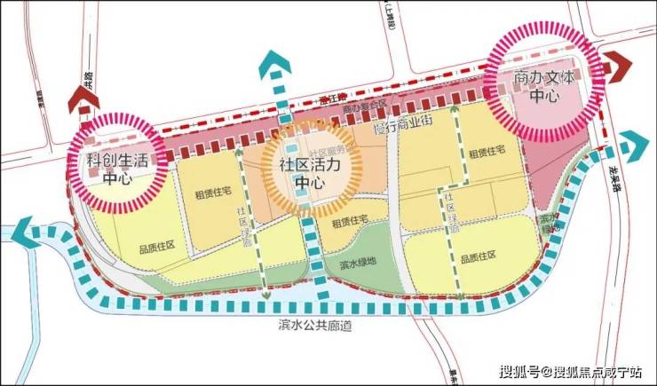 “三核”即围绕虹建路站打造科创生活中心,集聚高端商务、商品住房、人才公寓;围绕澄江路站打造商办文体中心,通过下沉广场与地铁相连,集聚品质商业商办;中部打造社区活力中心,集聚多种公共服务设施及开放空间,包括2所幼儿园、1所九年一贯制学校、社区行政、文化活动、健身运动、卫生服务、养老福利、菜场等设施。