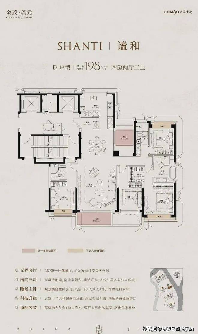 科技系统:集成“”(除湿降噪等)+,支持场景一键切换(如晨起模式自动调节灯光/窗帘),全屋三玻两腔隔音玻璃。