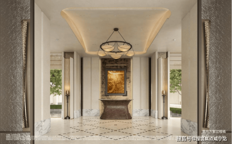 入口处悬挂量身定制的装置作品,以现代语言呼应新经典主义美学,从第一印象奠定社区艺境格调。