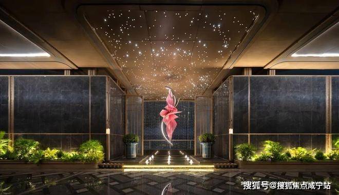 下沉式环幕庭院,跌水景观环绕,池底仿黑金砂与宝石晶片闪烁,点缀百余灯珠,师法“琉璃水光” 形意,糅合视听五感,打造全浸式立体园境,天工巧夺,嘉定未见。