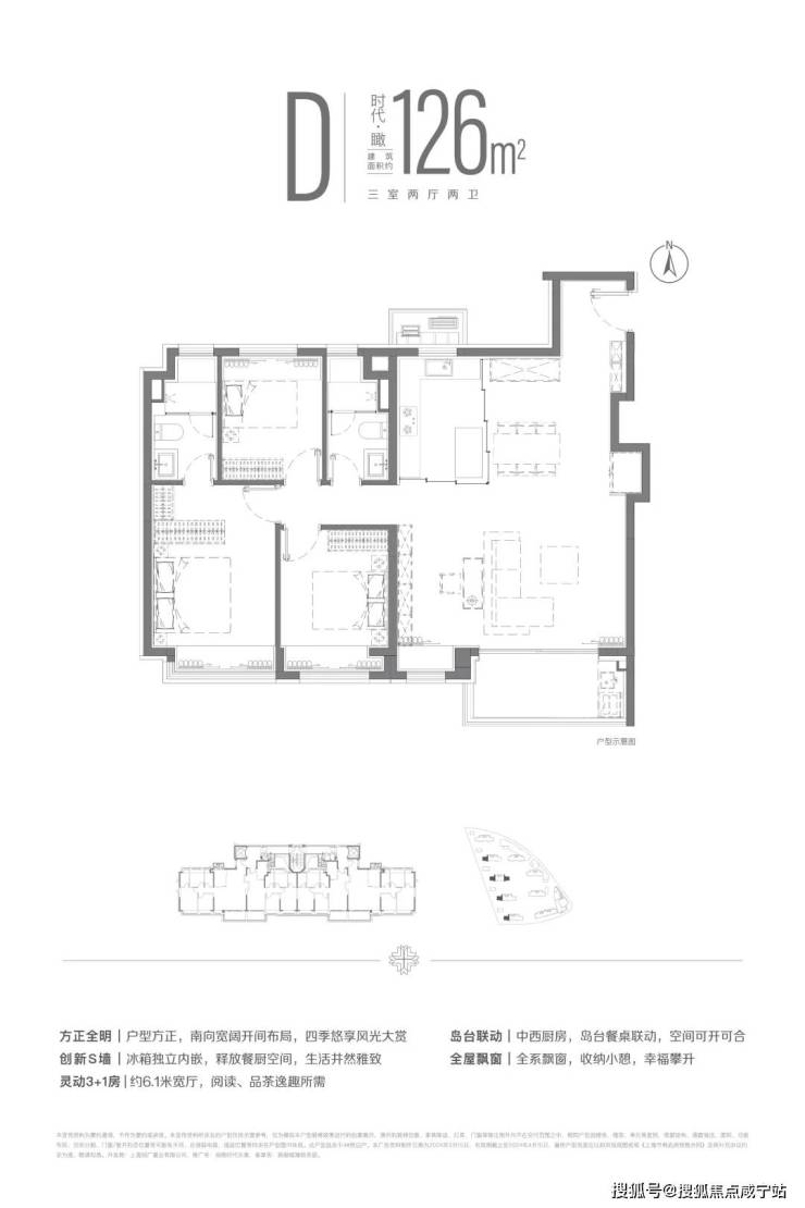 建面约126m²三房两厅两卫户型,南向3+1面宽横厅设计,让空间更加随心而变。主卧双台盆配置,用空间拥抱自然中的无限自在。