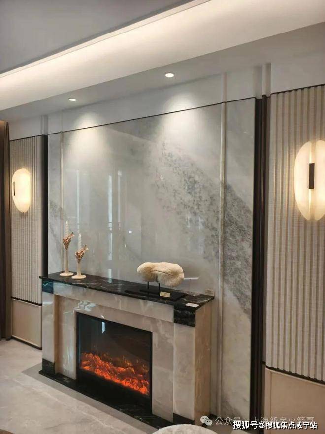 电视背景墙采用巴西产奢石+金属弧面收边设计,非常有质感: