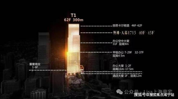 T1 -300米超高层塔楼上部46-62层为五星级酒店(丽思卡尔顿)、38,40-45层行政公馆,中部7-37层为甲级办公,底部为商业及大堂。