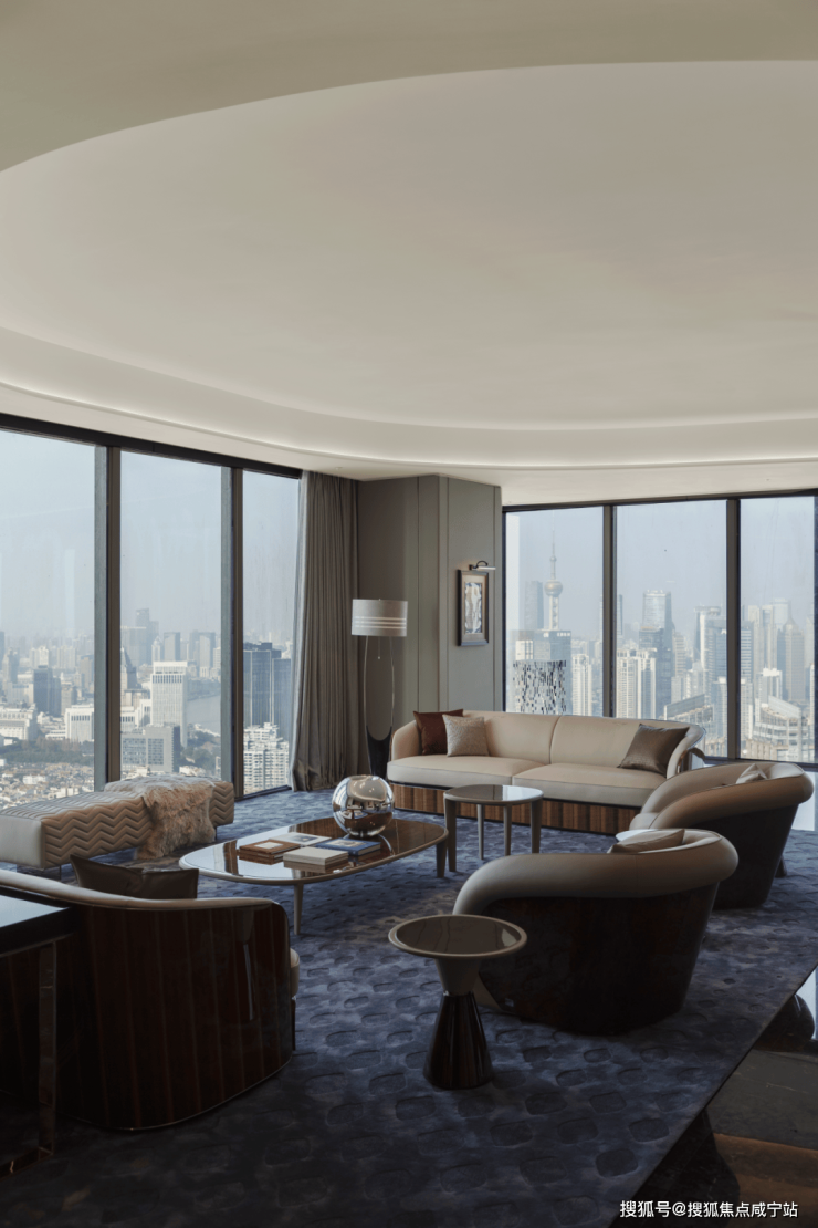 走道端处香槟色金属雕塑,形类城市高楼,又若恋人彼此依偎;全采光套房拥揽白日上海黄浦的忙碌、繁华,也收藏夜晚灯火阑珊的宁静、美好。