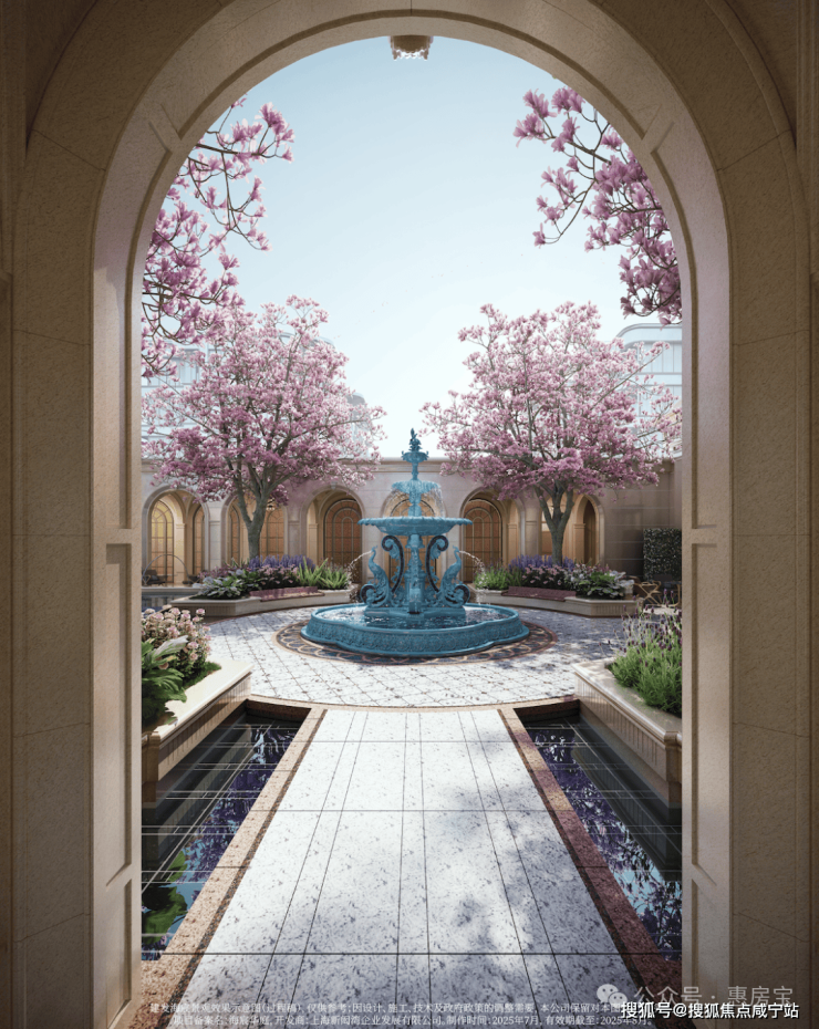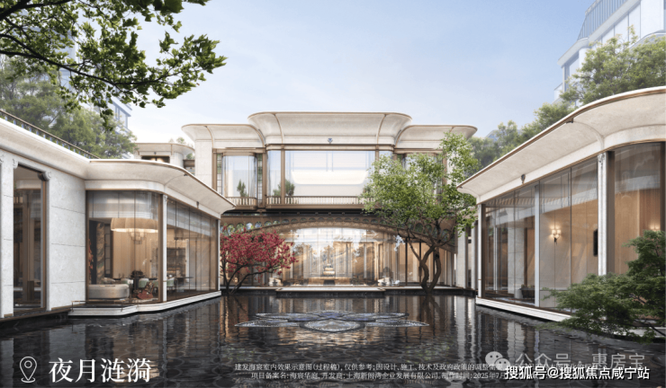 漫步约200米繁花长廊纵轴,贯穿五重东方院落礼序,步步生景:「海天华堂」巍然端庄,玉兰门庭仿若有暗香浮动;「华亭烟雨」清波舒卷,晕染江南底色;「凤亭问泉」水声泠泠,回荡浪漫旋律;「夜月涟漪」以下沉水院为镜,倒映高定摩登会所;「黄浦秋涛」对望水岸公园,盛景起伏宛若潮涌。