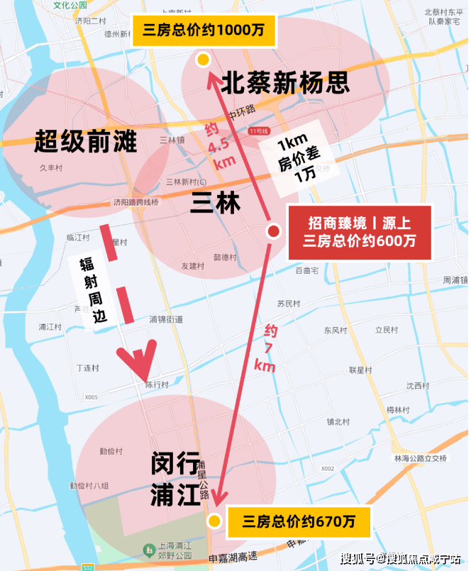 而招商臻境单价则依旧处于性价比十足的“6”字头,建筑面积约95㎡三房总价仅约600级,相比之下,北面直线距离约4.5km的北蔡新杨思,板块在售新房单价陆续超10万+/㎡,想买三房预算需破千万,每隔1km房价就几乎相差1万。