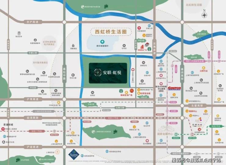 高铁/空港:依托虹桥交通枢纽,高铁快速连通长三角各大城市,直飞航班覆盖东亚、南亚;高速/高架。