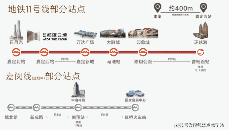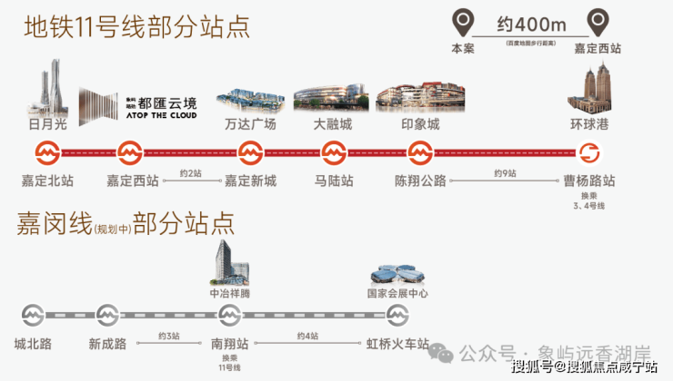 交通方面:项目距离轨道交通11号线嘉定西站直线400米左右,附近还有嘉定客运中心,交通便捷。另外,项目临近沪宜公路、距离沈海高速约1.5公里,上海绕城高速约3.5公里,自驾出行也十分便捷。
