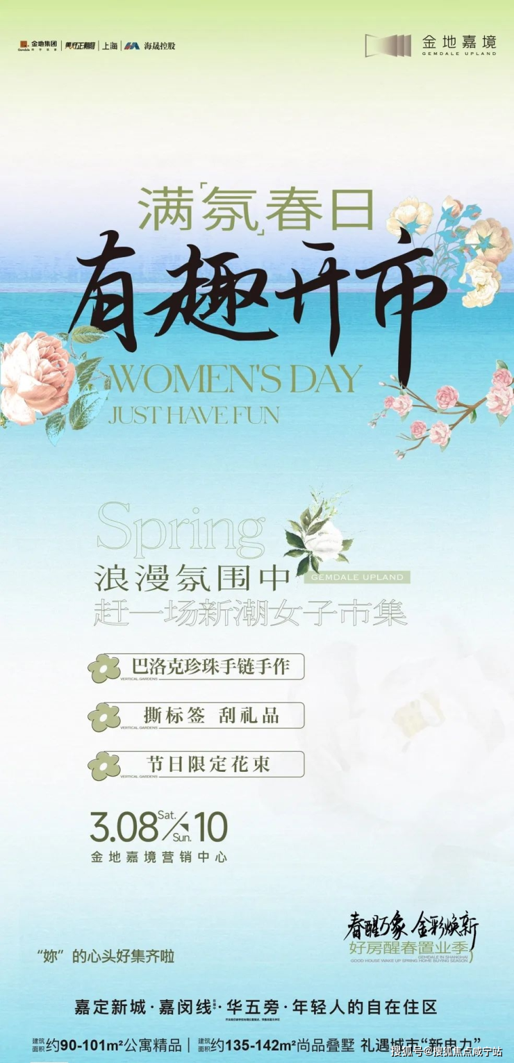 3.8妇女节来临之际,上海告别了一直的阴雨天气,终于有了春天的感觉。金地嘉境准备了多重醒春焕新活动。这个周末新潮的女子市集,一定要去逛!到访可免费领取妇女节限定花束,认购成交还可免费抽奖,100%中奖!!