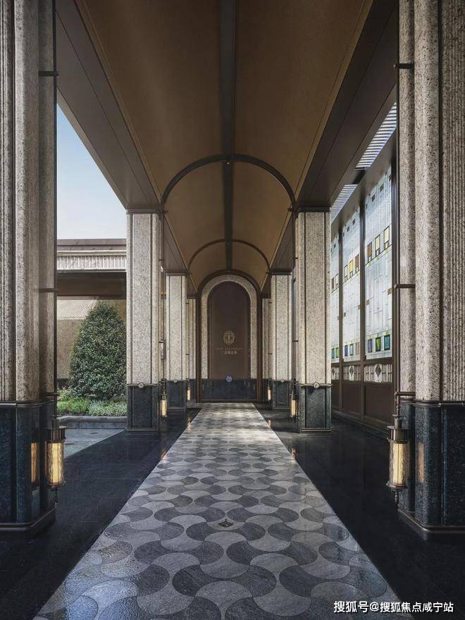 约30米的艺术连廊,借鉴PRADA荣宅多立克柱式以及和平饭店的拱形廊道,摩登海派,魅力十足: