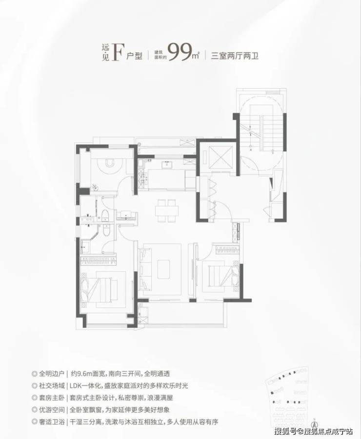 ②建面约99㎡H户型:三面采光,全能景观王炸边厅户型!