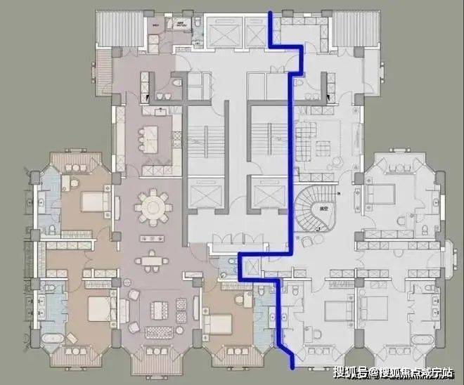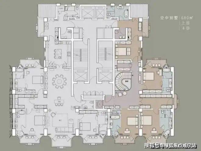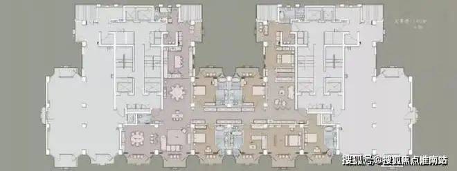 右面是680㎡复式套的一半(单层),同样户型随便创意,而且每户都配备了室内电梯,以及,这个户型上下共有10个阳台